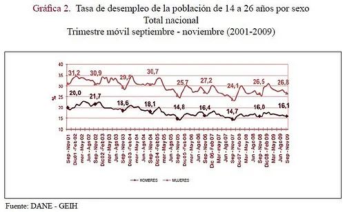 En este orden de ideas, la mejor evidencia que se puede presentar son los datos del último periodo respecto al desempleo juvenil, el cual se ubica en el 18,9% para los jóvenes entre 14 y 26 años de edad (Ver Gráfica 1), mientras que el promedio del total nacional es de apenas del 10,5% para el mismo periodo (DANE). Esta es una situación que merece atención ya que se refleja en el historial de desempleo juvenil desde el 2001, mostrando como para las mujeres jóvenes la cifra no ha descendido del 24% y para los hombres jóvenes no ha descendido del 20% (Ver Gráfica 2). Esto se compara con la tasa de desempleo nacional, la cual ha mantenido un promedio del 11,62% en los últimos diez años, alcanzando su máximo en el año 2002 con un nivel del 14,7% (DANE), lo cual implica que el desempleo juvenil en promedio, siempre ha sido mayor al desempleo nacional.