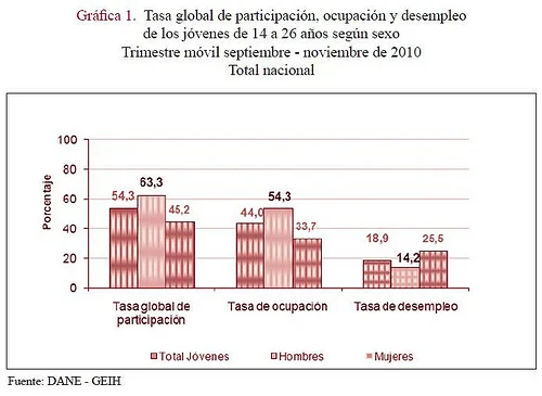 La idea del éxito de la gestión gubernamental en los últimos años, se sustenta en que la economía colombiana ha tenido un crecimiento neto de su PIB de 4.1%, con respecto al que tuvo la región en promedio de 3.1% (World Development Indicators (WDI) & Global Develpment Finance (GDF)., 2010). La confianza inversionista, la buena imagen del país y las excelentes oportunidades de negocios que el territorio colombiano ofrece, han sido determinantes para que el Producto Interno Bruto (PIB) se haya comportado de manera satisfactoria en estos años. A pesar de la crisis, descubrimos que es posible dinamizar la economía y tener un horizonte lleno de oportunidades. No obstante de esta mermelada de buenos tiempos, se evidencia una contradicción en la idea del “éxito” mencionada en principio: las cifras de desempleo hoy en día se ubican en el 11.8% y el 51,7% de los ocupados tiene un empleo informal; de éstos, 51,4% eran hombres y 48,6% mujeres (Gráfica 1). Estas cifras son, sin lugar a dudas, la muestra de cómo para unos este crecimiento económico ha sido muy favorable, y como para otros no ha significado una mejoría en su calidad de vida. Las anteriores cifras, además de que son preocupantes en cuanto a la idea determinística de “éxito” que se nos ha querido vender, se suman a la problemática del desempleo juvenil, tema en el cual se concentrará el siguiente artículo.
