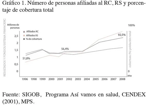 Cuando se introdujo la ley 100 de 1993, se aseguró que para el año 2001 aproximadamente 23 millones de colombianos estarían en el régimen contributivo, aportando recursos para la financiación del sistema de salud de modo que fuera sostenible mantener el aseguramiento subsidiado. Hoy, de los 40 millones de colombianos que tienen acceso al sistema de salud, 23 millones pertenecen al régimen subsidiado, y solo 17,5 millones pertenecen al régimen contributivo; de estos, solo 7 millones cotizan, de modo que los 10 millones restantes son beneficiarios. Este hecho revela que el sistema actual difiere de forma significativa al planteado inicialmente en la reforma y que contrario a lo esperado, la participación de ambos regímenes de afiliación en el sistema se ha invertido. Dicho desbalance, que se ha venido ampliando en los últimos 10 años (ver gráfico 1.) ha hecho que gran parte de los usos del RS deban ser financiados con recursos del estado; razón por la cual el gasto público destinado a este rubro ha venido en ascenso sostenido, llegando a representar en el año 2006 más del 17% del gasto público total de ese año (ver gráfico 2).