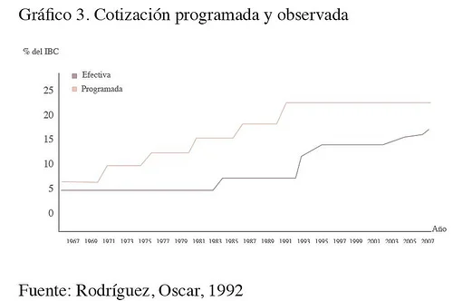 El primer intento de organización del sistema pensional colombiano se dio en 1967 con la creación del Instituto de Seguro Social (ISS), con el cual se estableció en Colombia el régimen financiero pensional de Prima Media Escalonada que funcionaría con aportes tripartitos (Estado, patrón y afiliado) y para el cual estaban programados incrementos periódicos en la tasa de cotización hasta alcanzar una tasa permanente de aporte de 22% a partir de 1992[5]; Sin embargo, estos ajustes al sistema nunca se efectuaron estrictamente como se muestra en el gráfico 3 (línea roja: cronograma de cotización, línea gris: cotización observada) y por lo tanto para 1993 la tasa efectiva era apenas de 6.5%. Además de esto, el cambio demográfico de la población colombiana implicó menores aportes y mayores gastos; adicionalmente, el incumplimiento en los aportes del estado, así como la evasión por parte de muchos empleadores, llevó a que aumentara rápidamente las presiones sobre el gasto público de tal forma que para 1990, el pago por concepto de pensiones a cargo del gobierno central llegó a ser de 0.8% del PIB de ese año; ya que durante las décadas anteriores no se había recaudando los fondos suficiente para cubrir con estas obligaciones amparadas por la ley.