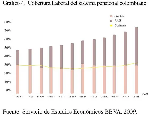Para retratar el problema de la cobertura, es suficiente exponer algunas cifras. Por ejemplo, el RPM mostró desde su creación una deficiente capacidad de aumentar la cobertura la cual pasó de 18% de la PEA en 1973 a algo más del 20% en 1990. Aunque la Ley 100 de 1993 logró un aumento sustancial del número de afiliados, pasando de 5 millones en 1995 a 9,2 millones en 2002, dicho incremento no ha sido suficiente. Para el año 2008, el sistema contaba con cerca de 14,8 millones de afiliados, de los cuales sólo 5,8 millones aportaban efectivamente (3,8 millones en el RAIS y 2 millones en el RPM)[7]. Esta diferencia entre cotizantes y afiliados, es explicada básicamente por la baja fidelidad presente en el sistema, generada por la alta informalidad del mercado laboral, así como los ciclos económicos recesivos y su efecto negativo sobre el empleo.
