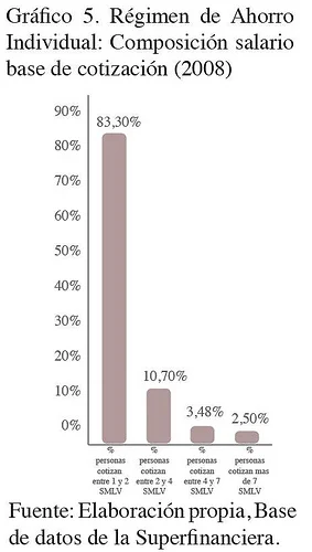 En cuanto al del régimen de ahorro individual, este ha empezado a mostrar serias deficiencias para garantizar su autofinanciamiento como resultado de las exigencias legales de la GPM y la estructura de ingresos de los afiliados al sistema de seguridad social. Actualmente, más del 80% de los cotizantes al sistema poseen un salario base de cotización que oscila entre uno o dos salarios mínimos legales, como se observa en el gráfico 5. Estas personas en su mayoría, estarían recibiendo una tasa de retorno del 100% del salario, para los que cotizan con un salario mínimo. Faltantes que evidentemente, pasarían a aumentar el pasivo pensional a cargo del Estado.