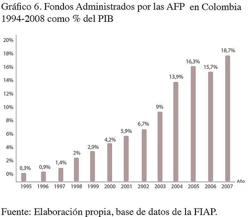 Entre las AFP que tienen operaciones en el país y las cuales concentran cerca de 8 millones de afiliados a pensiones obligatorias, se consolidan un fondo por valor de $ 56.3 billones de pesos. De este modo, el portafolio administrado por las mismas ha pasado de representar el 0,35 del PIB en 1995 al 18,7% de este en el año 2007, como se presenta en el gráfico 6.
