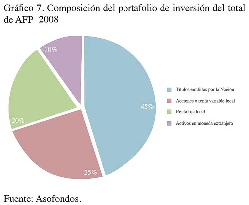 A pesar del importante volumen de recursos que manejan las AFP, las opciones de inversión para estas han sido históricamente reducidas y están sometidas a una fuerte vigilancia y control por parte de las Superintendencia financiera, pues como se ha visto hasta el momento, dichos fondos han servido para financiar gran parte de la deuda pública; esto explica por qué la composición actual del portafolio de inversión de los AFP tiene invertido cerca del 45% de sus recursos en títulos de deuda pública, como se observa en el gráfico 7.