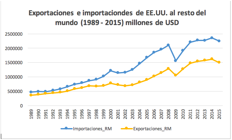 Para empezar, nos gustaría recordar, brevemente, el panorama de Estados Unidos que precedió a la Gran Depresión. Para 1934, se inaugura la política de acuerdos comerciales a partir de la cual se abría de “par en par sus puertas a las mercancías extranjeras” (Hoselitz, 1944). Como lo menciona Hoselitz (1944) la filosofía en la que se basaba la política comercial de Estados Unidos estaba guiada por la independencia respecto a las fuentes extranjeras que se podían producir en Norteamérica, y un comercio de exportación grande y creciente. Resulta importante observar cómo desde ese entonces la balanza comercial tanto en importaciones como en exportaciones ha mantenido un comportamiento creciente a lo largo del tiempo (ver gráfica 1). Aunque parte de la filosofía planteada se ha venido cumpliendo, hoy día la postura frente a la viabilidad de los tratados comerciales no termina de convencer a los partidos tradicionales norteamericanos, factor que se ha convertido en un álgido tema en el debate electoral.