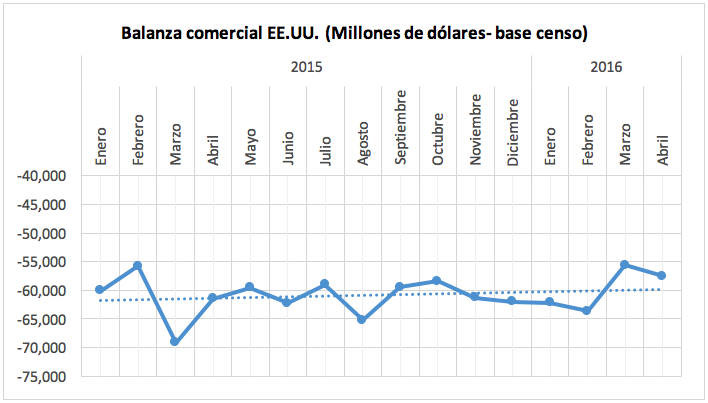 Durante su período de gobierno, el presidente Obama ha centrado la agenda comercial en torno al aumento de las exportaciones y la generación de empleo en la economía doméstica. Como se menciona en el documento The President’s trade agenda, made in America, por cada billón de dólares en exportaciones se soportan entre 5200 y 7000 trabajos para la economía norteamericana (USTR,2015). El informe también muestra la estructura abierta y participativa que tiene la economía de EE.UU. con el comercio internacional; por lo que, en este contexto se enmarca la política comercial multilateral del país, enfocada en establecer acuerdos comerciales que promuevan la entrada de productos y servicios estadounidenses a mercados foráneos que dinamicen la economía doméstica. Sin embargo, las cifras de la balanza comercial del país no han evidenciado cambios sustanciales y estructurales, en cuanto a la relación de importaciones y exportaciones. Esto se evidencia en la gráfica 2 que muestra el comportamiento deficitario estable de la balanza comercial en 2015 y parte de 2016.
