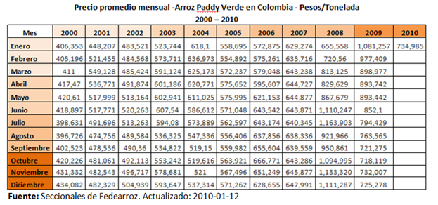 Pero como lo indica el adagio popular, “después de las vacas gordas vienes las flacas”. Siguiendo la sensación de bienestar y abundancia que había dejado el 2008, por un incentivado aumento de la frontera agraria para suplir la demanda interna, se acrecentó el número de productores de este cereal y rápidamente cayeron los precios que tan preocupantemente habían subido. Lo que finalmente terminó sucediendo fue un duro golpe a los arroceros, el precio del arroz registró una caída de 160 mil carga a 100 mil pesos en menos de un año y con una clara tendencia a la baja. Inexplicablemente el precio al consumidor está subiendo [1].
