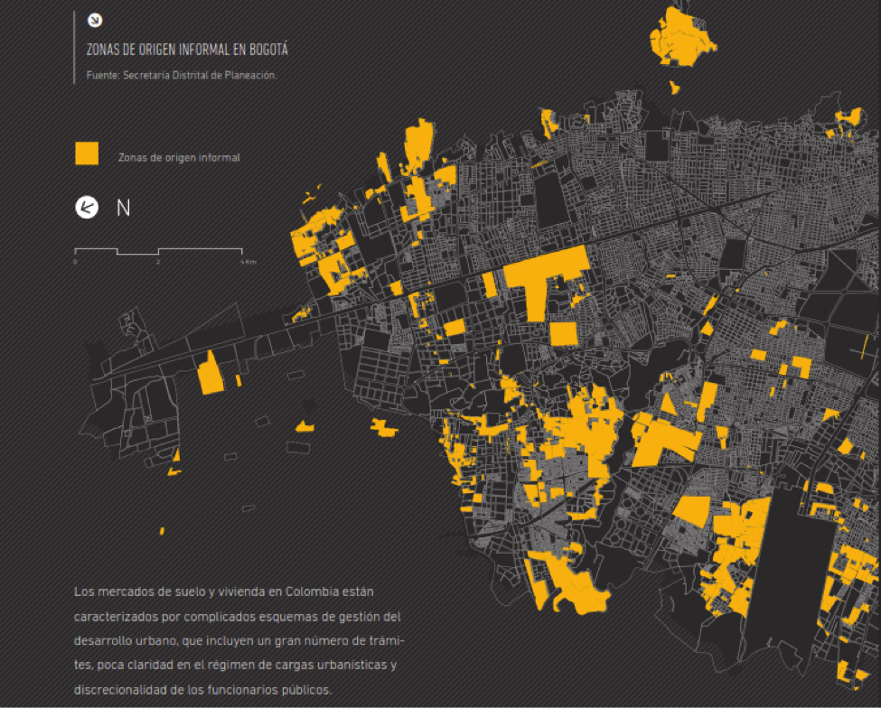 Sin embargo el bienestar general de los ciudadanos no solo es impactado por las mejoras en movilidad, sino que a su vez viene articulado por el uso del suelo para vivienda formal como parte fundamental de garantizar una buena calidad de vida en las ciudades. Algunos de los problemas que se presentan en el ordenamiento territorial vienen dados por causas como la no correspondencia entre dinamismo demográfico dinamismo económico de los hogares, una consecuencia de ello es que exista una insuficiencia en la oferta de suelo para vivienda formal, lo cual lleva al contundente hecho de que la mitad de las ciudades colombianas tienen el origen de su proceso de urbanización en la construcción de viviendas en la informalidad (Lozano, Panman, Samad, & Rodriguez, 2012) A partir de este análisis se presenta a Bogotá como ejemplo privilegiado para mostrar que más allá del exceso de demanda existente, la causa principal de esta insuficiencia radica en un complejo diseño de mecanismos para la asignación de recursos financieros y tierras para vivienda formal, como también su ordenamiento físico en el territorio dispuesto para ello.