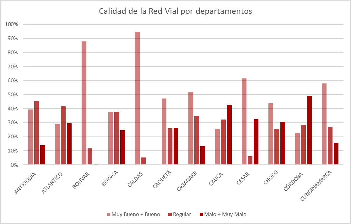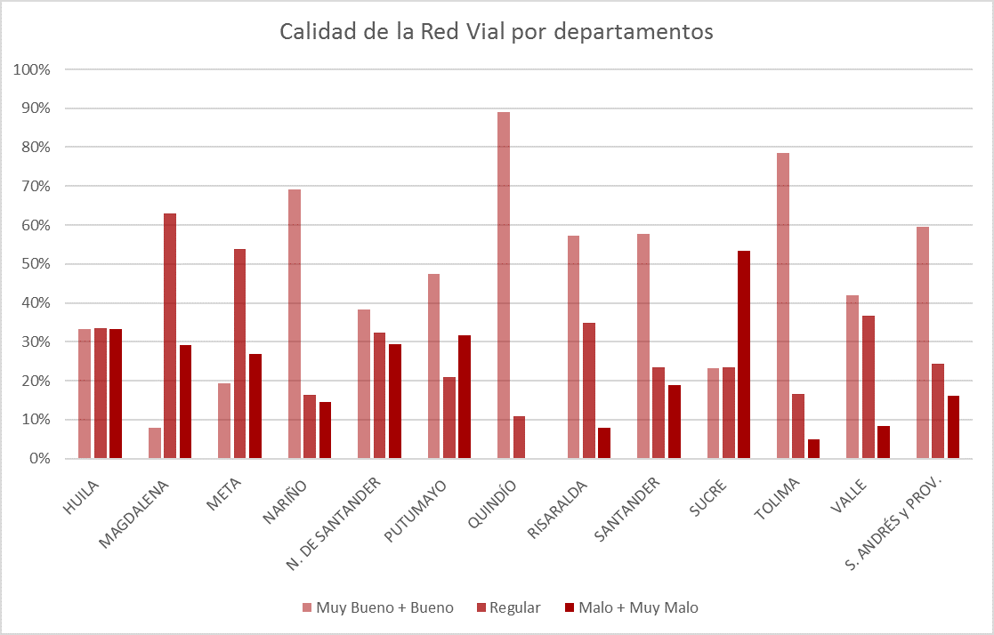 No será sorpresa para nadie que Colombia no tiene una buena calidad de vías, en efecto, los medios de comunicación y la misma población se mantienen en un ciclo continuo de crítica frente a la infraestructura vial del país. De igual manera, es necesario conocer el verdadero estado de la red vial: del total nacional, el INVÍAS (2013) determinó que únicamente el 72% de las vías están pavimentadas y del total, el 25% está en condiciones malas o muy malas. Debe ser de preocupación que uno de cada cuatro kilómetros de vía esté en malas condiciones, empero, existen matices a este resultado. Algunos departamentos como Bolívar, Caldas, Nariño, Quindío y Tolima tienen al menos el 79% de sus vías en buen (o muy buen) estado y ninguno tiene más del 5% en un estado malo o muy malo (ver Gráfica 1). Por otro lado, Cauca, Córdoba y en particular Sucre tienen grandes retos por delante con más del 40% de sus vías en las dos categorías más bajas y algunos otros como Magdalena y Meta tienen menos del 20% de sus vías en los mejores estados (donde más de la mitad son regulares).