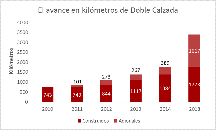 Siguiendo estas ideas, otro indicador sobre la calidad de la infraestructura vial es la cantidad de kilómetros de carretera que son conformados por vías de doble calzada. Previo al año 2011 se tenían 743 kilómetros construidos de doble calzada y en el 2014 se estimaba que se construyeron otros 1030 kilómetros. Este fue un avance importante, se construyeron más del doble de distancia de lo que se tenía tan solo cuatro años antes. Incluso, las predicciones de kilómetros de doble calzada para el 2018 con las vías de cuarta generación rondan los 3400 km, el doble de lo que había en el 2014 y más de cuatro veces que en el 2010 (ver Gráfica 2; Andrade, 2014).