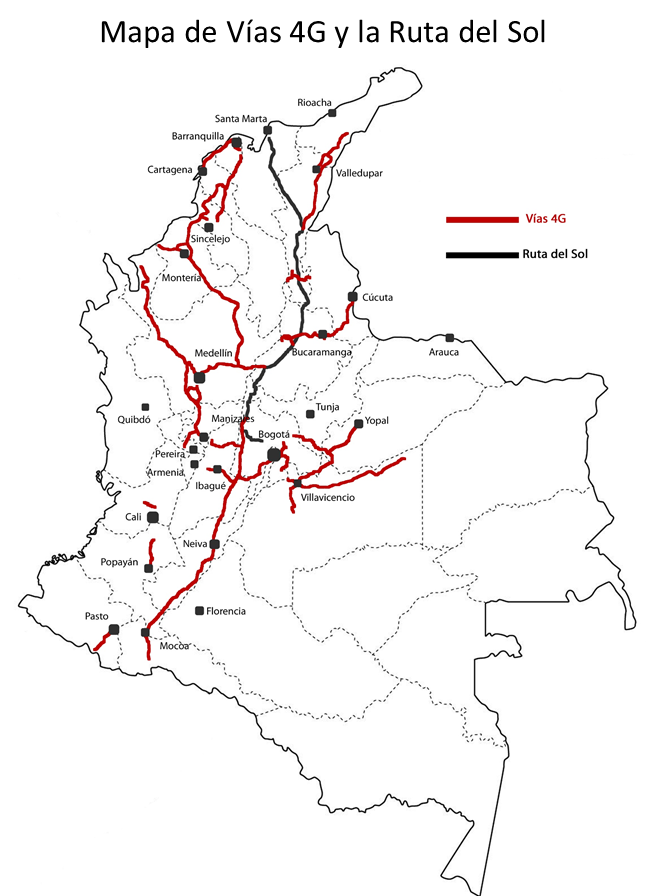 Para comenzar el análisis, se presenta en la Imagen 1 un mapa indicando por qué lugares pasan las vías 4G y la Ruta del Sol, y la Imagen 2 ilustra las vías de mayor congestión y los principales corredores por los que se mueven mercancías de importación y exportación. Comparando los mapas, se evidencia que se han escogido exactamente las rutas que representan las mayores necesidades en tanto a su tráfico frecuente y a los beneficios económicos que le pueden generar a las empresas importadoras y exportadoras.