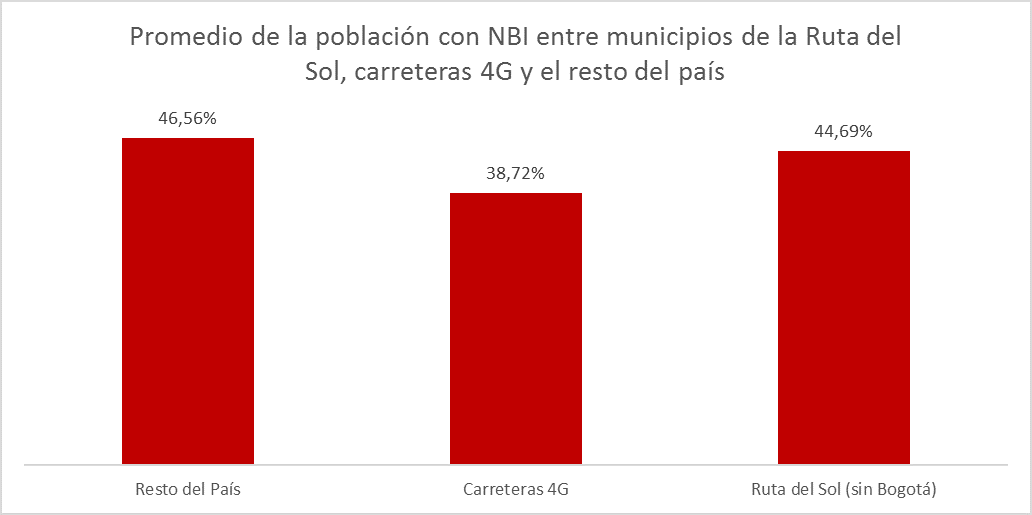 En general, los municipios que están siendo conectados por las carreteras 4G y por la Ruta del Sol no son los que se consideran más pobres (ver Gráfica 3). En promedio, los municipios entre los que se encuentran las 4G tienen al 38,7% de su población con necesidades básicas insatisfechas (NBI), los de la Ruta del Sol tienen en promedio al 44,7% de su población en las mismas condiciones y el promedio del resto del país es de algo más del 46%, según el DANE (2017) y la ANI (2017). Estadísticamente, se puede concluir que el promedio de NBI en los municipios de la Ruta del Sol no son diferentes a los del resto del país, pero en el caso de las 4G, sí se puede afirmar que el promedio de necesidades básicas insatisfechas es diferente[2] al del resto del país. El plan del gobierno está beneficiando a unos de los municipios más ricos del país –o, en su defecto, a los menos pobres-. Tan solo es suficiente ver la Imagen 1 para darse cuenta que algunos departamentos de la periferia del país no están siendo beneficiados con ninguna obra por el momento. En esta situación se encuentran: Arauca, Chocó, Caquetá, Vichada, Guanía, Amazonas, Vaupés y Guaviare.