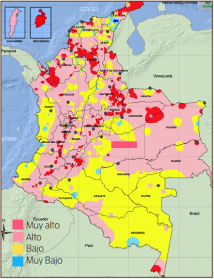 Del mismo modo, en este estudio se muestra cómo la variabilidad climática del país, incrementada considerablemente por los continuos fenómenos del Niño y de la Niña, genera grandes riesgos hacia la población por posibles catástrofes naturales, por ejemplo deslizamientos e inundaciones. Estos problemas tienden a perjudicar la productividad y bienestar del país, y asimismo generar pérdidas tanto económicas como sociales, principalmente en el sector agropecuario, vivienda y vías terrestres. Según este estudio del Banco Mundial, estas pérdidas seguirán en aumento si no se toman medidas ambientales a tiempo sobre zonas que presentan alta vulnerabilidad, como se puede ver en la imagen. Además, el estudio indica la importancia de una gestión eficiente del suelo:
