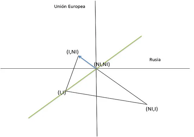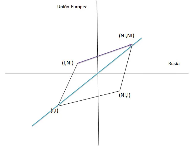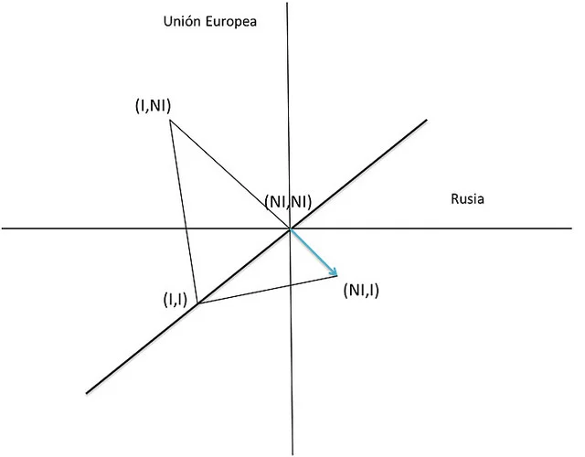 En la Figura 1 se observa un eje vertical y horizontal. Todos los puntos por encima del eje horizontal implican que al menos la Unión Europea (UE) obtiene beneficios netos por la elección que realiza, mientras que todos los puntos por debajo implican que obtiene pérdidas netas; los puntos a la derecha del eje vertical indican que Rusia obtiene beneficios netos por la elección que realiza, mientras que todos los puntos a la izquierda implican que obtiene pérdidas netas. El punto (I,NI), por ejemplo, indica que UE obtiene beneficios netos debido a que interviene militarmente de manera directa o indirecta en Europa del Este, mientras que Rusia en ese punto obtiene pérdidas netas debido a que no interviene militarmente o interviene por medios pacíficos. También se representa numéricamente la situación, especificando en una tabla los valores de ganancias y pérdidas que obtienen los dos países para cada elección. Se supuso que una intervención unilateral de la Unión Europea sobre las áreas que disputa geopolíticamente con Rusia era menos costosa (los pagos son (1,-1)) que una intervención unilateral por parte de Rusia((-4,4)) debido al potencial de ataque ruso con el armamento heredado de la Unión Soviética. El equilibrio de Nash se alcanza en el punto (I,NI).