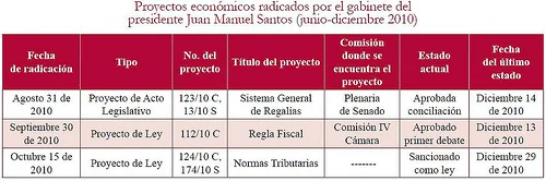 Finalmente, al realizar este breve panorama de las iniciativas más importantes en materia económica, es posible concluir que, a pesar de las fisuras que se han encontrado al interior de la coalición de gobierno, esta ha logrado impulsar y aprobar los proyectos promovidos por el gabinete del presidente Santos.