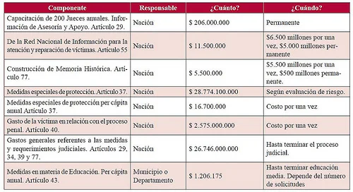 El valor de cada uno de estos componentes que se detallan en la tabla anterior no es cuantificable con exactitud, dada su dependencia del número de víctimas que se reconozcan en la Red Nacional de Información para la Atención y Reparación. Esto se dificulta más cuando el conflicto puede continuar y arrojar nuevas víctimas incrementando el número de personas a atender y es menos sostenible cuando se extiende el horizonte de tiempo. Por tal razón, la certificación de la viabilidad del proyecto por parte del Ministerio de Hacienda queda aún en tela de juicio.