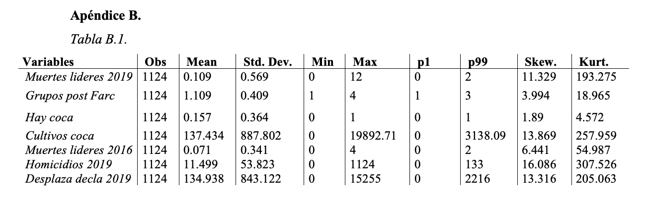 Se puede evidenciar un mismo número de observaciones para todas las variables: 1,122 (número de municipios). Por otra lado, pese a una media importante de cultivos de coca y desplazados, respectivamente 137.43 y 134.94, se evidencia un aumento de 0.038 en la media de muertes de líderes sociales para 2019 respecto al 2016. Ahora, el valor máximo de cultivos a nivel municipal es 19,892.7 hectáreas mientras, el máximo número de muertes de líderes son 12 homicidios, demostrando que las dimensiones para las problemáticas difieren.