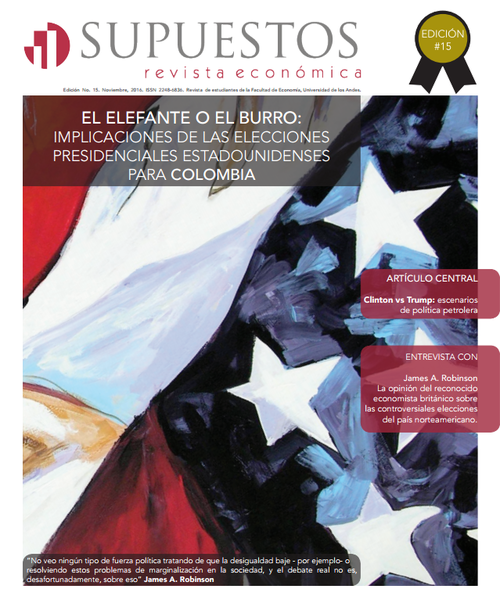 Para el caso particular de Colombia, los efectos del resultado de estas elecciones pueden ser muy importantes. ¿Cuáles son las implicaciones de la política fiscal de cada candidato? ¿Se puede ver afectado el comercio bilateral entre Estados Unidos y Colombia si llega Donald Trump a la presidencia? ¿Continuará la masificación del fracking en la extracción petrolera norteamericana? ¿Pueden caer las remesas que envían los colombianos radicados en aquel país a sus familias? La decimoquinta edición de la Revista Supuestos busca dar una respuesta a estas y otras preguntas referentes al tema.