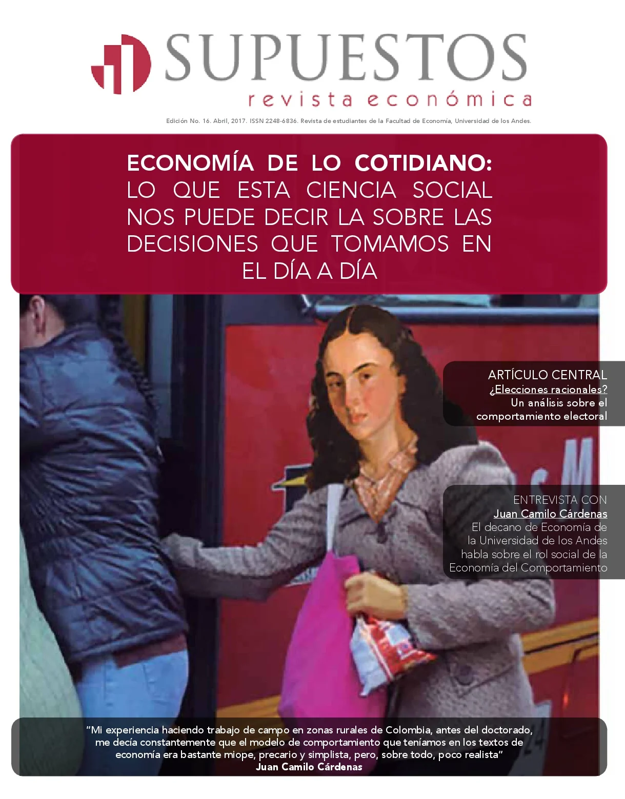 A lo largo de los últimos decenios, la Economía ha enfrentado cambios importantes. Los desarrollos que se han llevado a cabo en las aplicaciones económicas de la Teoría de Juegos y el auge de la Economía Experimental han sido la clave. Esta transición en las pretensiones de la ciencia, que algunos llaman el Imperialismo de la Economía, ha permitido que hoy los economistas nos acerquemos a temas como el efecto social del conflicto armado, las estrategias durante las campañas electorales, el cambio climático o hasta el análisis de tácticas de cobros desde el punto penal en el fútbol. La Economía del Comportamiento ha abierto la puerta a una infinidad de objetos de estudio con los que esta ciencia social ha empezado a involucrarse. ¿Podremos aprender a preservar un recurso tan valioso como el agua para las generaciones futuras? ¿Qué nos motiva a tener una determinada cantidad de dinero y no más ni menos en nuestra billetera? ¿Por qué las elecciones de los últimos años han tenido resultados tan inesperados? Estas son algunas de las preguntas que el equipo de la Revista Supuestos se propuso responder desde el análisis económico en su decimosexta edición impresa.